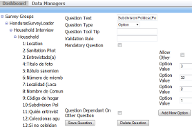 Surveys can be versioned and questions can be shared among multiple surveys to aid in normalization of data elements across localities. Surveys can be defined using a simple web-based editor or imported from a Google Docs spreadsheet. Once surveys are defined, they can be updated at any time and the devices will automatically be updated.